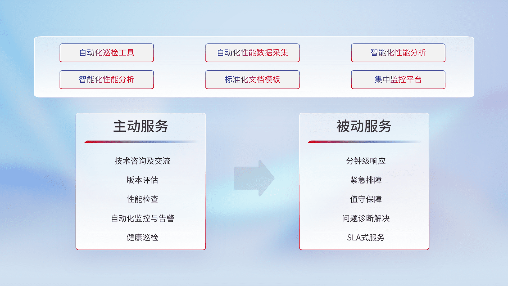 智能化工具和标准化文档,,保障服务质量,,,,提供主动服务(包含技术咨询、、、版本评估、、性能检查、、、自动化监控与告警、、、、健康巡检)和被动服务包含(分钟级响应、、、、紧急排障、、、值守保障、、问题诊断解决、、、SLA服务)。。。。